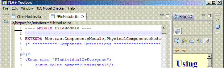 It has two folders. One contains two module-editor views for the module files ClientModule.tla and FileModule.tla. These views allow you to edit those files. The * preceding the name FileModule.tla indicates that the file has unsaved modifications. The other folder contains a Help view.