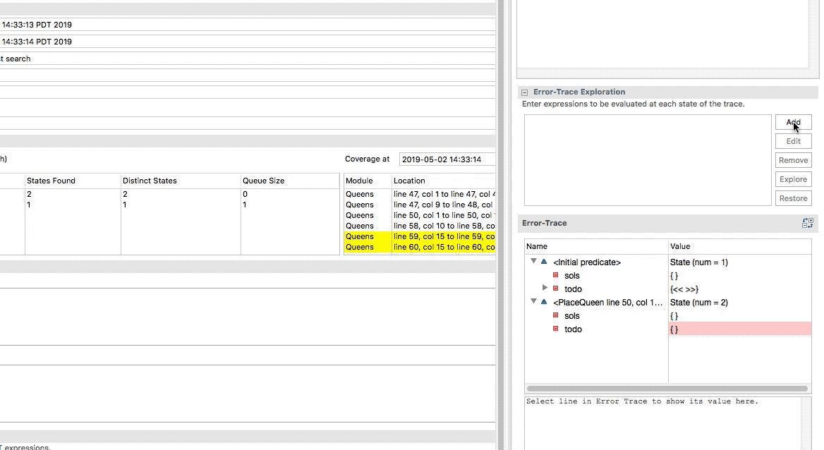 The Error-Trace viewer shows a structured view of the error trace produced by TLC. The view box shows the TLA+ version of the expression selected in the error trace. (It is ordinary text that can be copied and pasted elsewhere.)